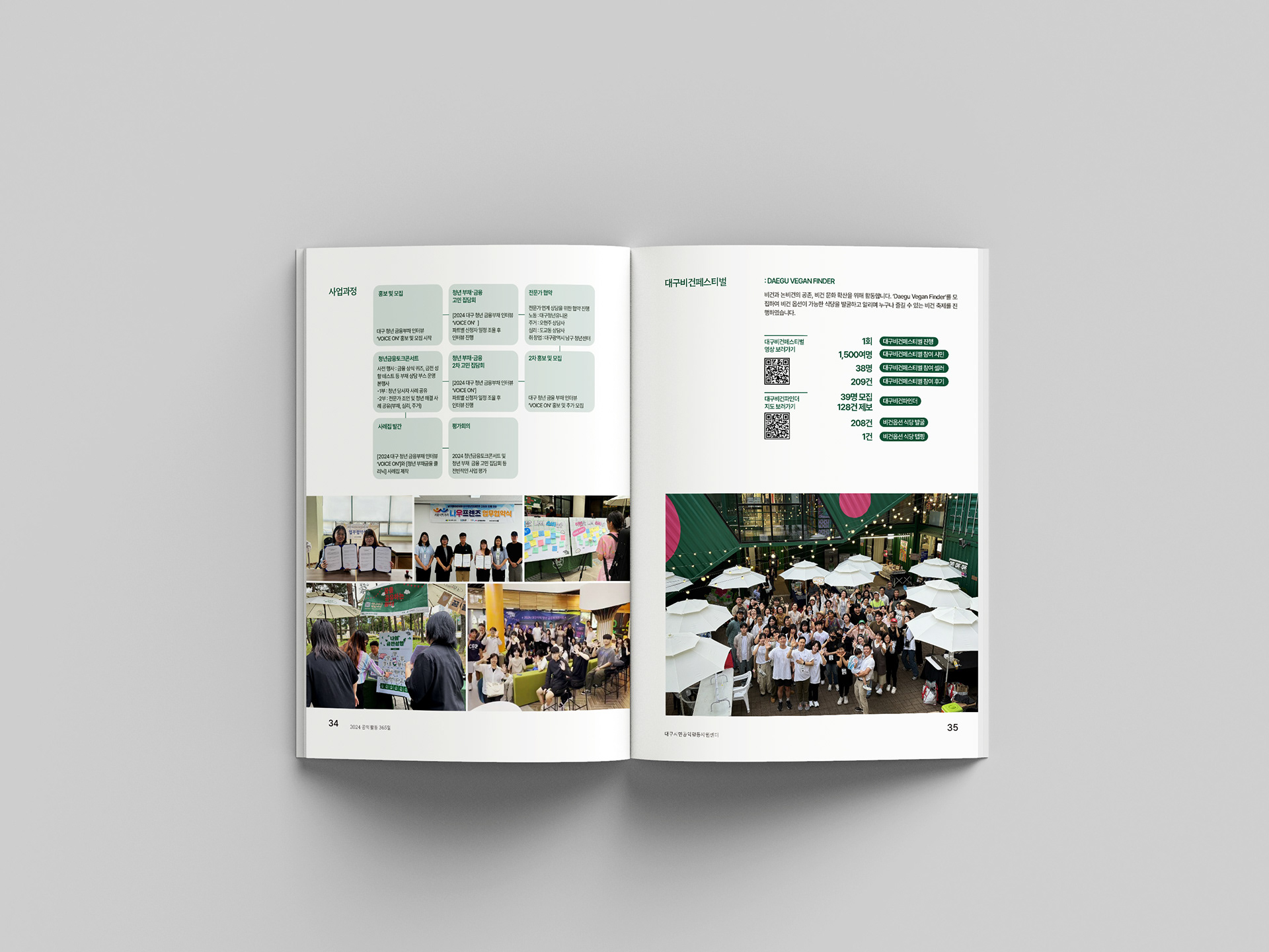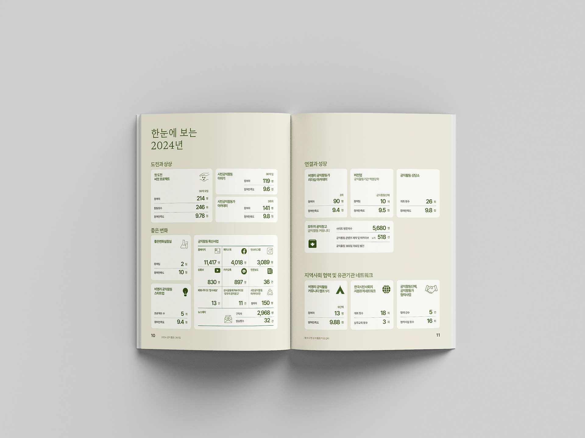 시각적 흐름에 집중해 구성했습니다. 각 챕터는 명확하게 구분되도록 설계했고, 인터뷰, 활동 사진, 인포그래픽 등