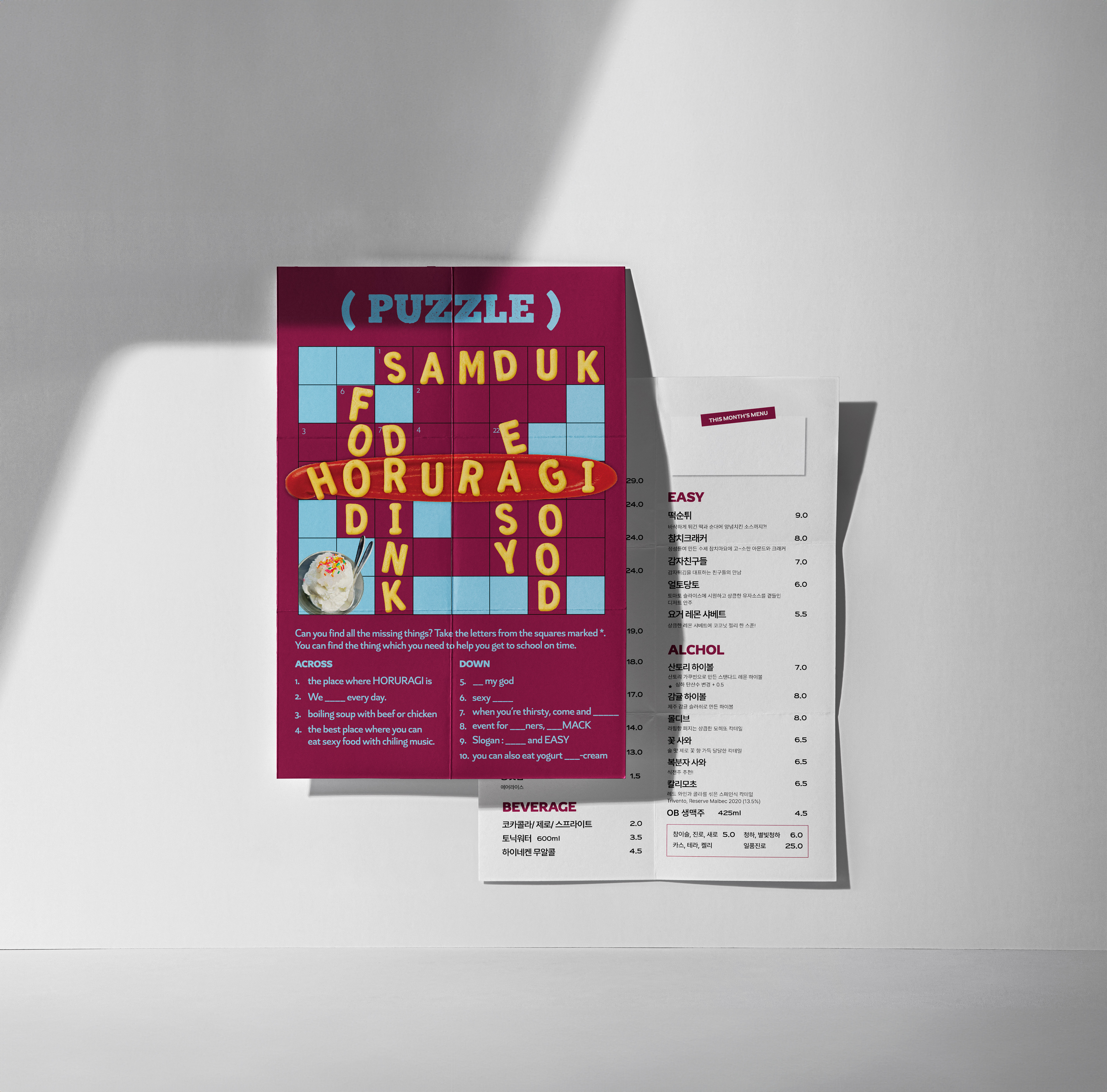 단순한 메뉴 안내를 넘어, 브랜드의 성격이 자연스럽게 드러나는 ‘재미있는 오브제’가 되도록 기획한 디자인입니다.