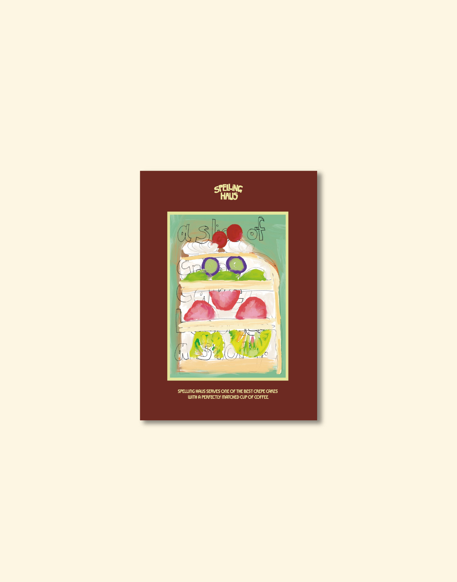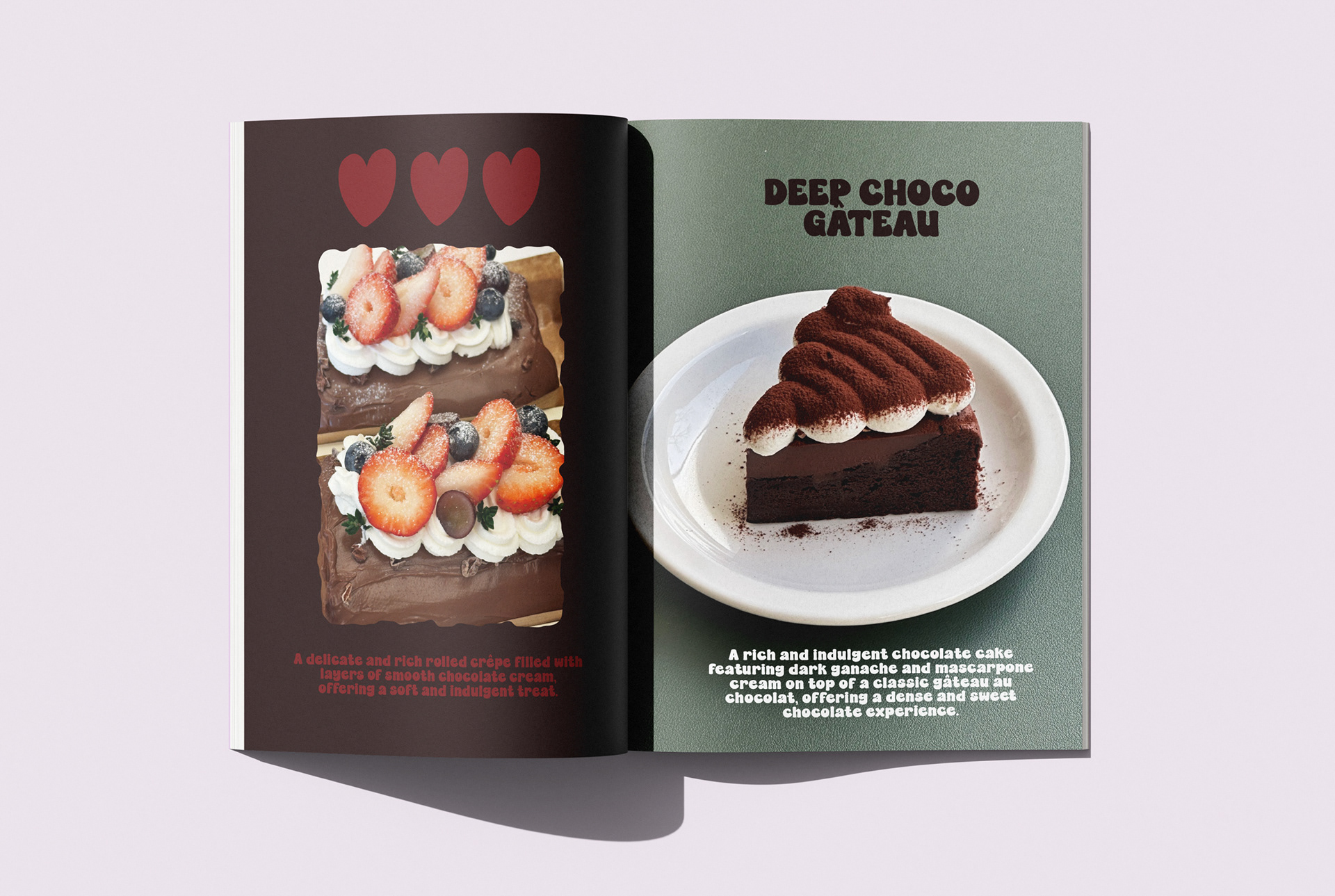 A key element of the visual system is the hand-drawn crepe cake illustration, which adds a kitschy charm while reinforcing the café’s signature menu item in a memorable way.