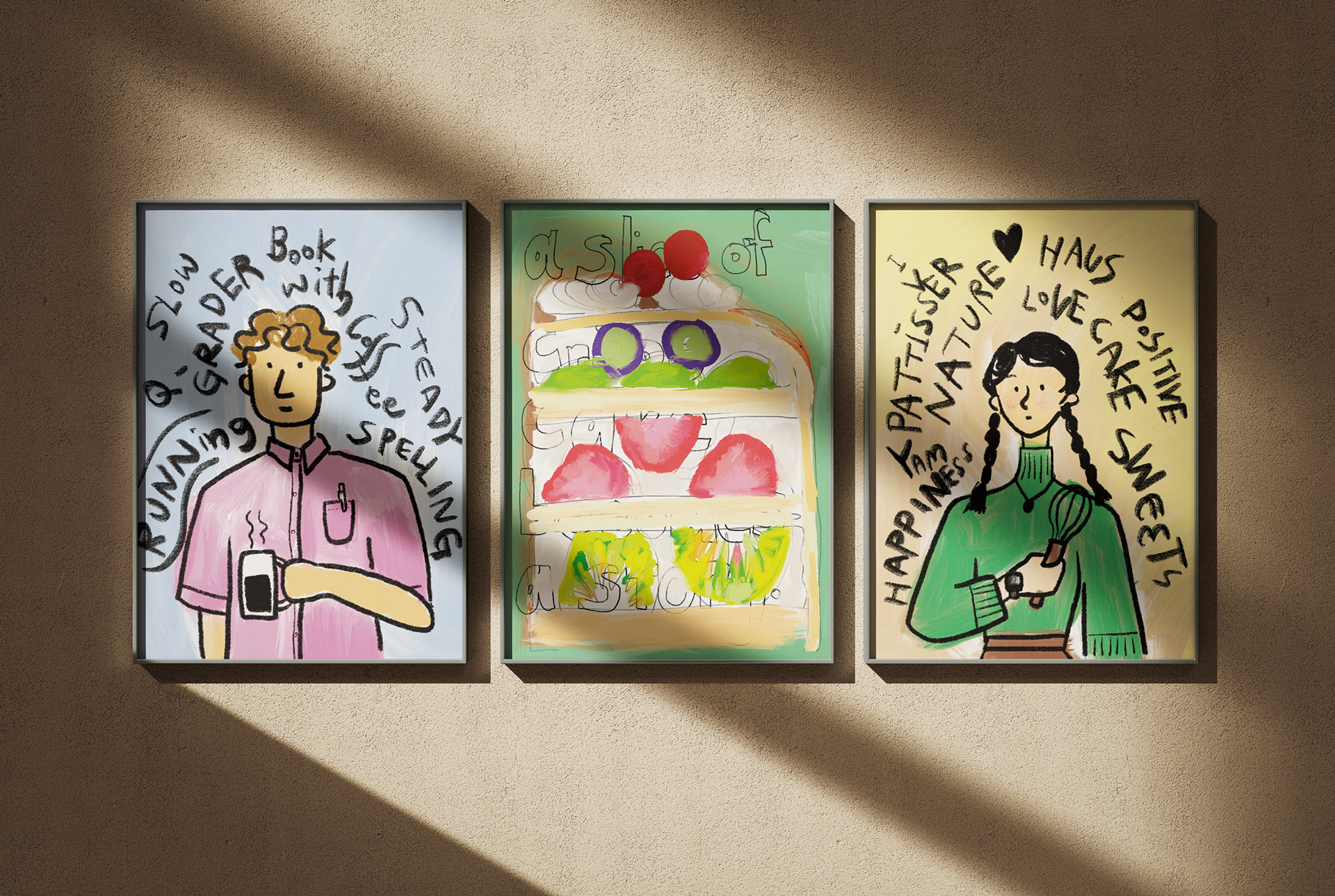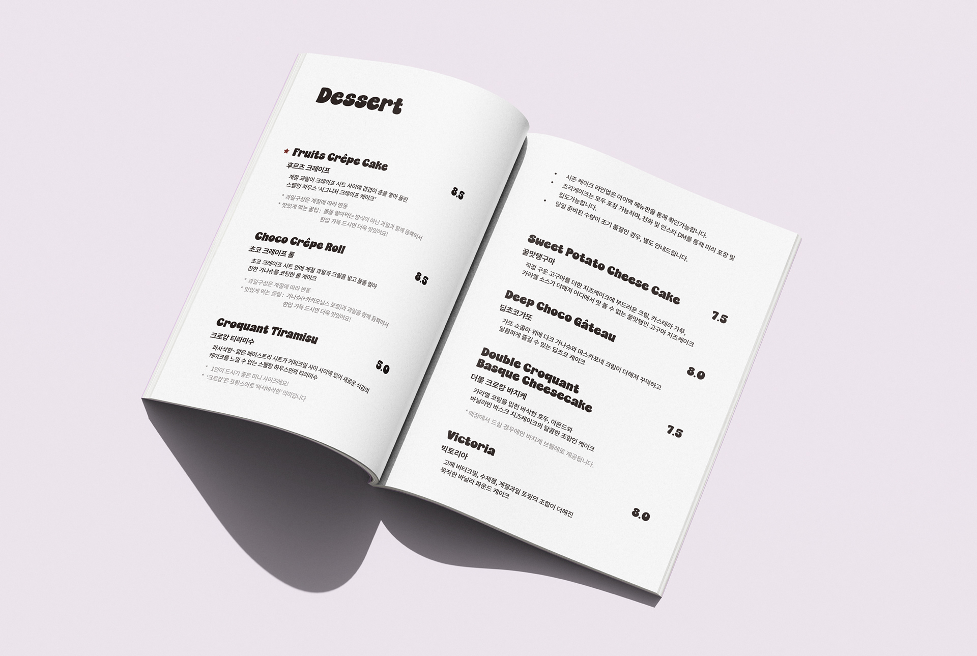 크레이프 케이크처럼 “한 겹씩 쌓이는 단어, 한 조각씩 모이는 이야기”라는 브랜드 스토리를 중심에 두고, 일상에 작은 변주를 더하는 공간이 되기를 바라는 마음으로 브랜딩을 진행했습니다.