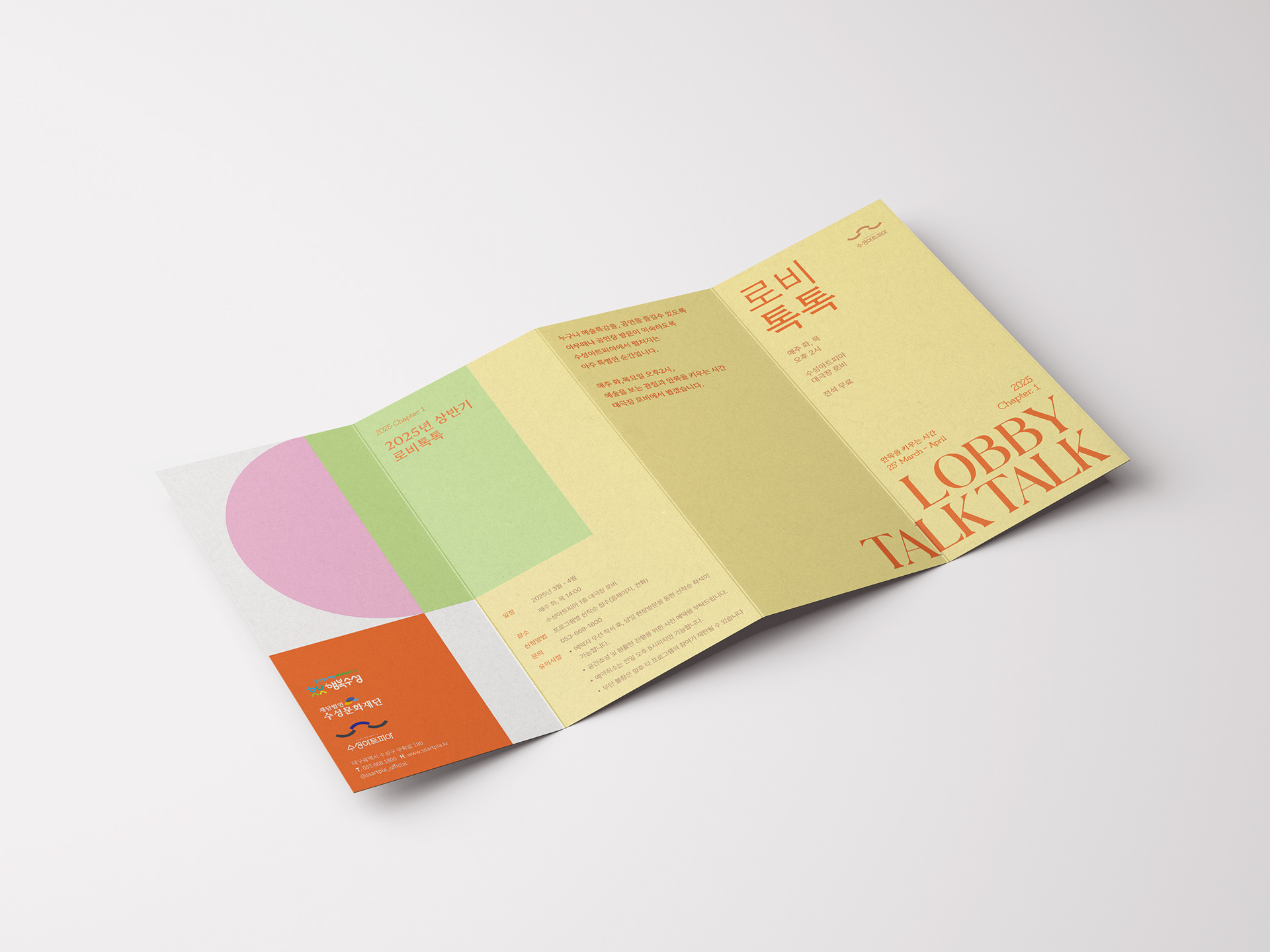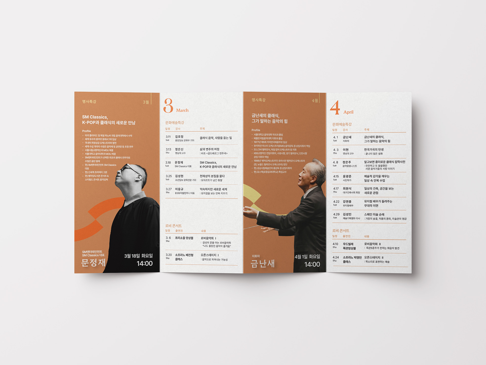 봄의 시작을 담아낸 Chapter 1의 밝고 경쾌한 분위기를 표현하기 위해 연노랑을 베이스로, 오렌지 컬러를 포인트로 활용했습니다. 내부는 웜브라운을 사용해 차분한 느낌을 더했고, 명사 특강의 핵심을 강조하기 위해 사진을 크게 배치해 가독성을 높였습니다. 정보가 명확하게 전달되면서도 따뜻한 인상을 주는 디자인을 목표로 했습니다.